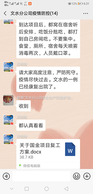 ---------文水分公司防疫防控工作 自新型冠狀病毒疫情爆發(fā)出現(xiàn),公司領(lǐng)導(dǎo)高度重視,為確保項(xiàng)目部能夠順利復(fù)工,以及職工能夠安全度過(guò)疫情期,文水分公司做了以下工作: 1、由王建立經(jīng)理統(tǒng)一領(lǐng)導(dǎo),分公司人員負(fù)責(zé)成立疫情防控小組,制定復(fù)工方案協(xié)助業(yè)主開(kāi)展防疫工作。新型冠狀病毒感染的肺炎疫情防控工作的處置由疫情防控工作領(lǐng)導(dǎo)小組統(tǒng)一領(lǐng)導(dǎo),全體人員無(wú)條件服從領(lǐng)導(dǎo)小組的指揮調(diào)度。以職工根本利益為出發(fā)點(diǎn)和落腳點(diǎn),依照法律法規(guī)和政策辦事,防止因處置不當(dāng)而造成疫情蔓延事件發(fā)生。