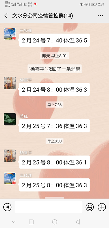 3、利用微信建群,做好公司疫情信息的搜集統(tǒng)計(jì)與分析工作,每日?qǐng)?bào)告體溫由專門(mén)負(fù)責(zé)人統(tǒng)計(jì)信息并報(bào)送總公司、業(yè)主、當(dāng)?shù)赜嘘P(guān)部門(mén)。