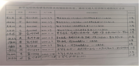 8、我們做了員工排查,建立返崗人員登記制度對(duì)返回人員登記,每天微信群詳細(xì)記錄職工身體狀況、假期外出情況、與重點(diǎn)疫區(qū)人員接觸情況等信息;對(duì)每名員工近14天的去向進(jìn)行排查;對(duì)來(lái)自或去過(guò)疫情重點(diǎn)地區(qū)的員工建立重點(diǎn)監(jiān)控清單,規(guī)勸其留在當(dāng)?shù)貢翰粡?fù)工,鼓勵(lì)員工延遲上班;對(duì)來(lái)自或去過(guò)疫情重點(diǎn)地區(qū)的員工排查其抵達(dá)時(shí)間,按規(guī)定落實(shí)醫(yī)學(xué)觀察、隔離等措施,確保其隔離觀察14天并經(jīng)體溫檢測(cè)正常、無(wú)不適癥狀后方可上崗。進(jìn)入崗位工作前自覺(jué)接受體溫檢測(cè),體溫正常方可進(jìn)入工作區(qū),并洗手消毒。嚴(yán)格執(zhí)行各項(xiàng)疫情防控要求,建立和落實(shí)復(fù)工上崗前個(gè)人防護(hù)知識(shí)培訓(xùn),多種方式普及傳染病防護(hù)知識(shí),做到有癥狀早發(fā)現(xiàn)、早報(bào)告、早隔離、早治療。