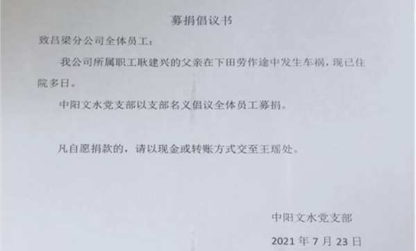 呂梁分公司某員工的父親因車禍住進ICU搶救多日,每天開銷巨大。中陽文水黨支部經(jīng)過全體會議通過發(fā)起愛心捐款活動。