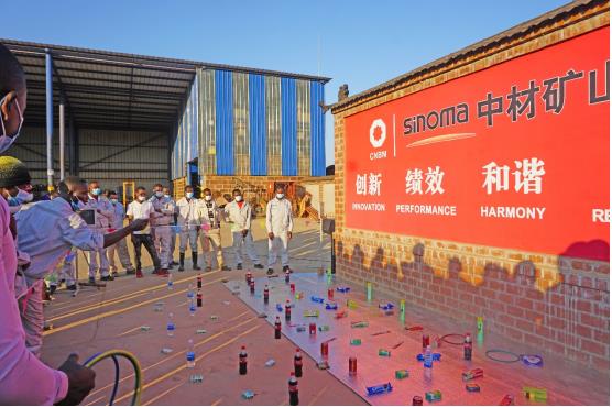 舉行以各生產(chǎn)部門為團(tuán)隊的拔河比賽,圖片為中方員工組成團(tuán)隊與贊方員工比賽圖。