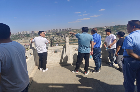 來到觀景臺邊,大家回望著來時的路,它就在腳下,不由得心懷感激,內(nèi)心充滿著自豪感。向遠(yuǎn)處眺望,奔騰的黃河在拐過大“幾”字彎沖出晉陜蒙峽谷后,進(jìn)入晉陜兩省交界處變得特別溫順,母親河的水也變得特別清澈,該段也是黃河唯一一段自東向西的流向,看著奔流不息的黃河水,寓意著中華文明源遠(yuǎn)流長,偉大的中國共產(chǎn)黨生生不息!